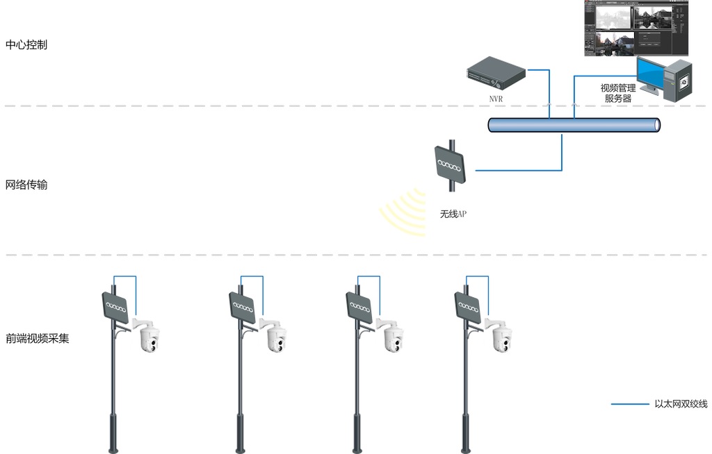 系統(tǒng)由前端雙波段攝像機(jī),網(wǎng)絡(luò)傳輸和后端監(jiān)控室組成。